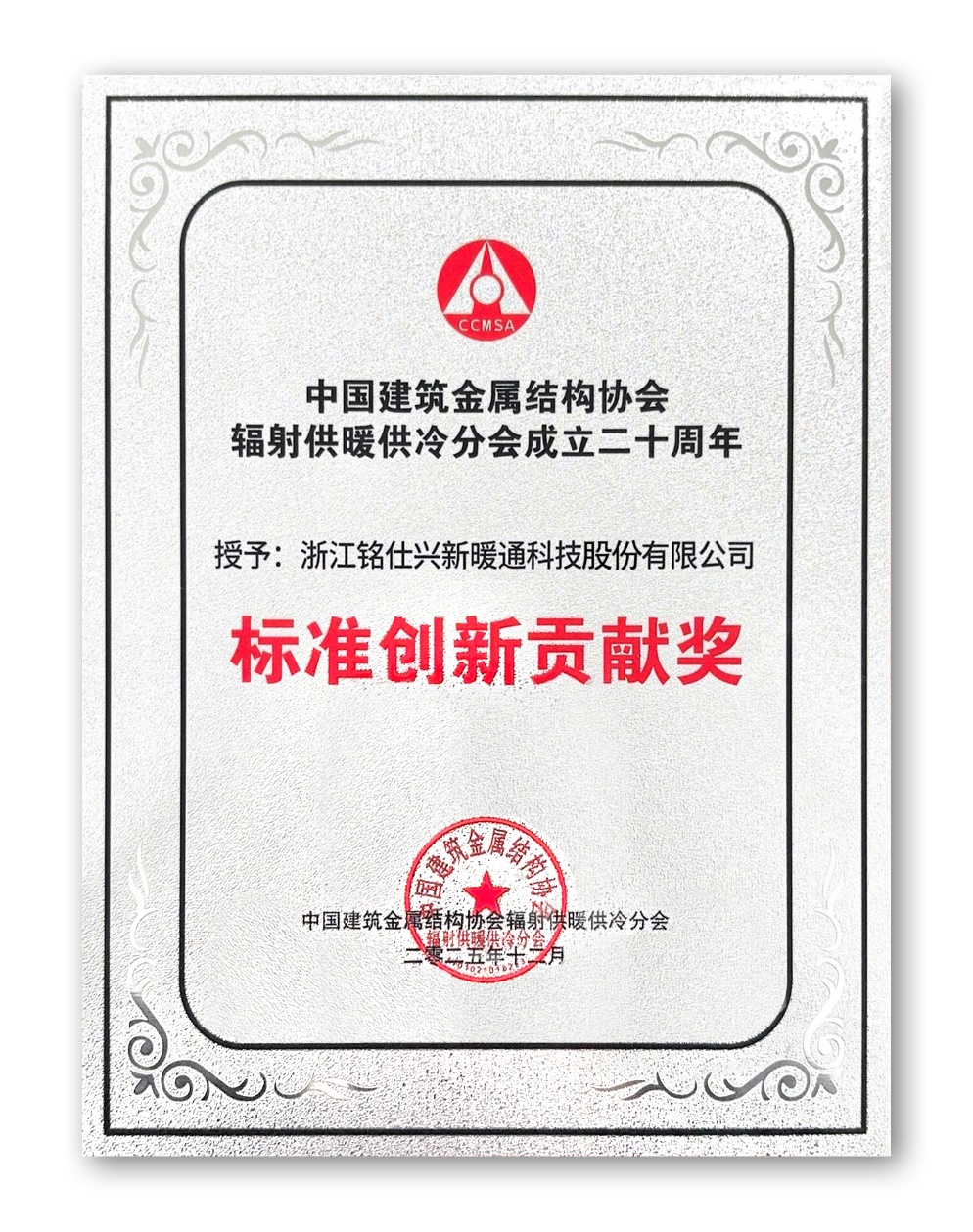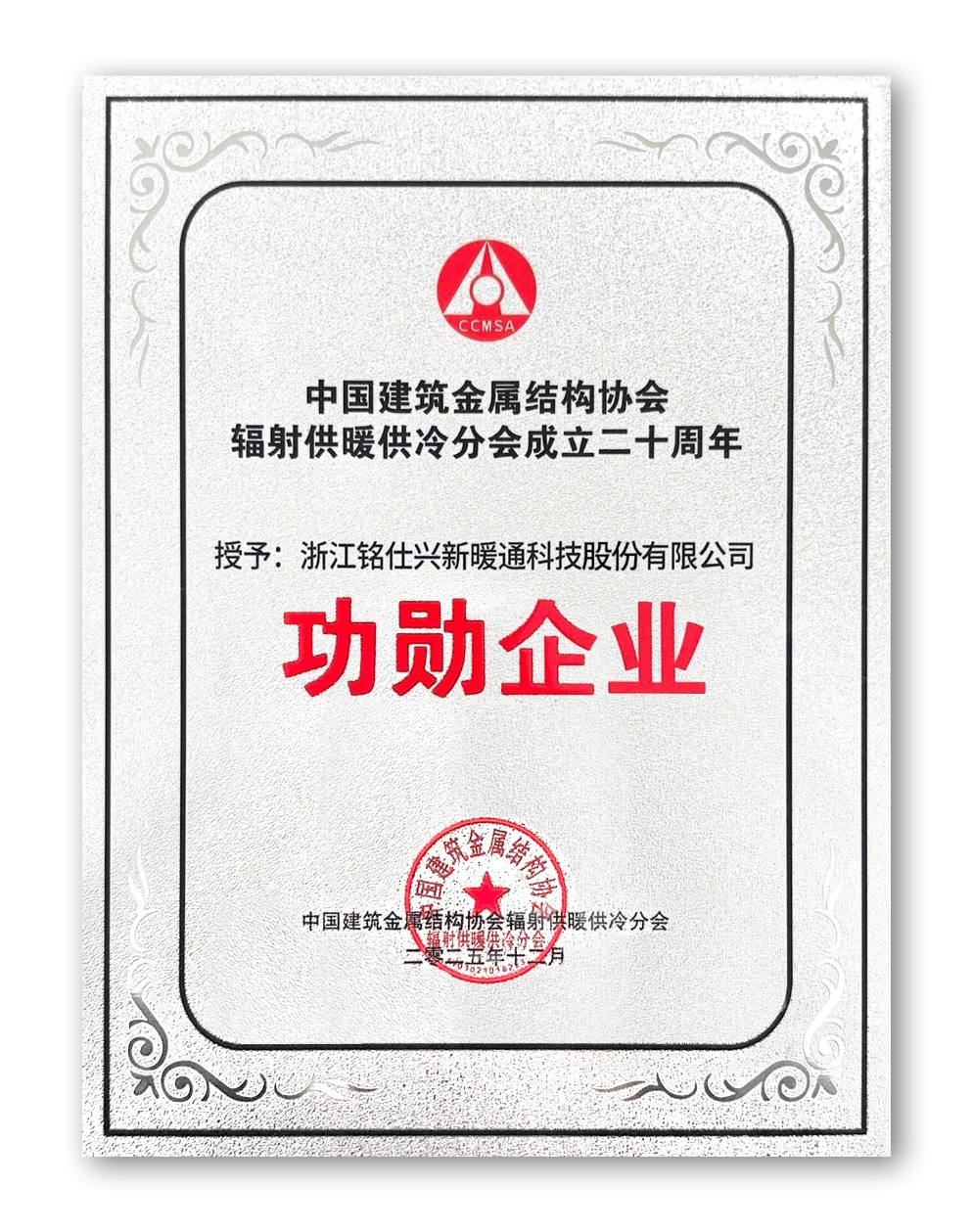 Coinciding with the 20th anniversary of the Radiant Heating and Cooling Branch of the China Construction Metal Structure Association, the year-end industry gala concluded successfully. Zhejiang Mingshi Xingxin HVAC Technology Co., Ltd. was honored with two distinguished awards—"Meritorious Enterprise" and "Standard Innovation Contribution Award"—recognizing its steadfast commitment and innovative breakthroughs in the industry, further cementing its position as an industry benchmark.